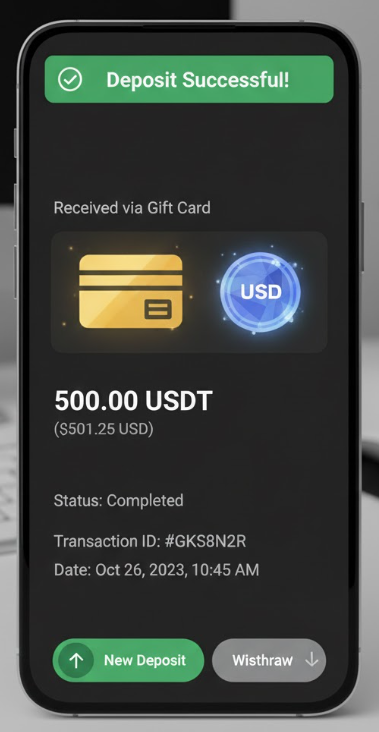 Alt Text: Digital wallet interface showing a successful deposit of USDT via Gift Card. Caption: Watch your portfolio grow securely with instant, verified deposits.